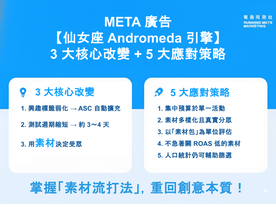 身為陪跑教練與 META 廣告實戰講師,我持續與業界高手交流,並用 AI 工具輔助分析,發現這一切都與 META 在 2025 年正式上線的 仙女座 Andromeda 演算法引擎 有關。